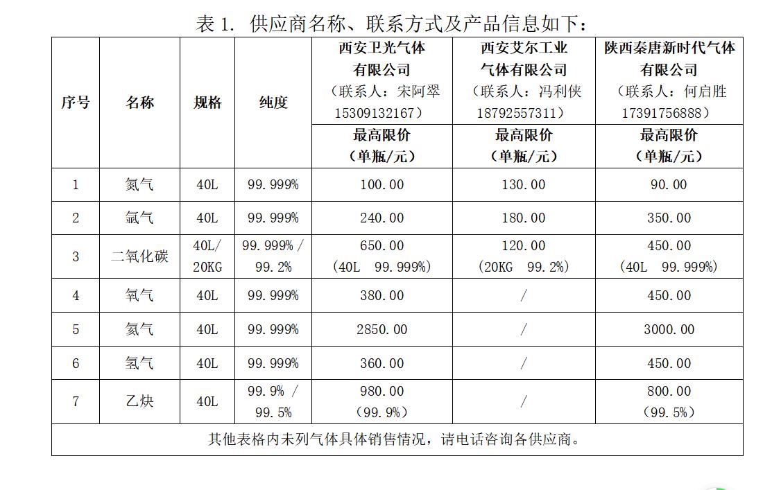 1.本次招标确定的供应商可提供实验室常用氮气、氩气、氧气、氢气、乙炔、二氧化碳等气体的供应服务。三家供应商分别为西安卫光气体有限公司、西安艾尔工业气体有限公司、陕西秦唐新时代气体有限公司。