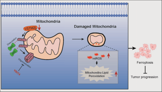 铁死亡作为一种新型程序性细胞死亡方式,能够增强晚期前列腺癌细胞对治疗药物的反应敏感性。电压依赖性阴离子通道1(VDAC1),作为线粒体外膜的关键组成部分,对维持线粒体稳态及调控多种细胞死亡模式起着至关重要的作用。然而,VDAC1在调控前列腺癌细胞铁死亡过程中的具体机制仍不明确。该研究综合运用分子生物学技术、细胞生物学方法及动物模型实验发现:VSTM2L与VDAC1存在直接相互作用,且VSTM2L主要定位于线粒体中;VSTM2L在前列腺癌中发挥促癌作用;敲低VSTM2L能够引发前列腺癌细胞发生铁死亡;VSTM2L敲低可导致VDAC1与HK2的解离,进而促进VDAC1的寡聚化,最终诱导前列腺癌细胞发生铁死亡。该成果揭示了VDAC1的互作蛋白VSTM2L在前列腺癌细胞中介导铁死亡调控的分子机制,拓展了对VDAC1寡聚化在铁死亡调节中的理论认知,并为前列腺癌的临床治疗策略提供了潜在的分子靶点。