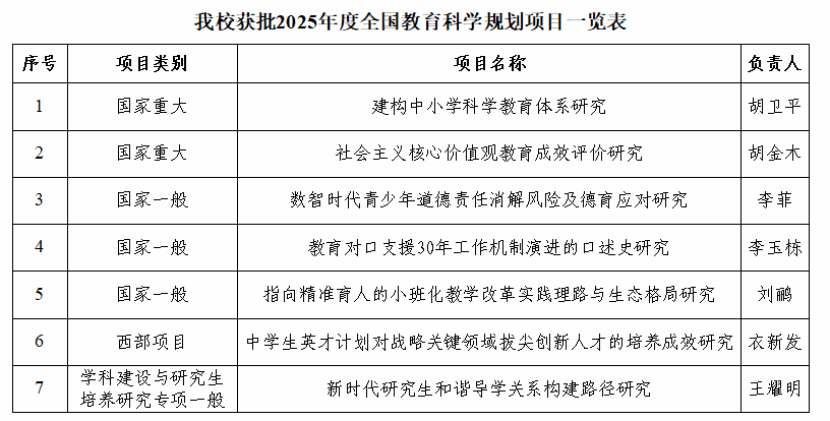 伟德官网获批的两项重大项目分别是胡卫平教授的“建构中小学科学教育体系研究”和胡金木教授的“社会主义核心价值观教育成效评价研究”。两个项目均聚焦中国特色教育学科发展,以对建构中国教育学自主知识体系有关键性作用的重大基础理论问题为主攻方向,推进知识、理论、方法和应用创新,为教育强国建设贡献力量。此外,伟德官网还获批3项国家一般项目、1项西部项目、1项学科建设与研究生培养研究专项一般项目,共计获批7项全国教育科学规划项目。